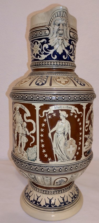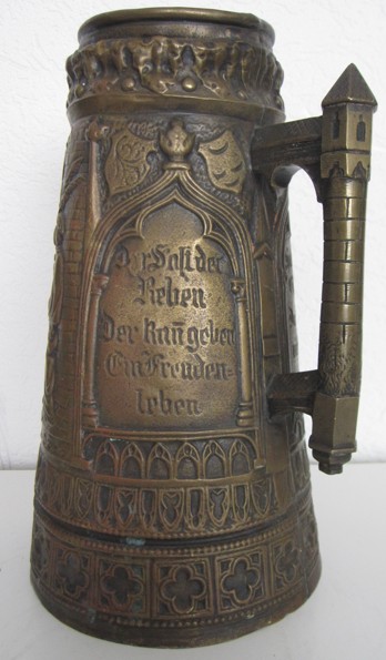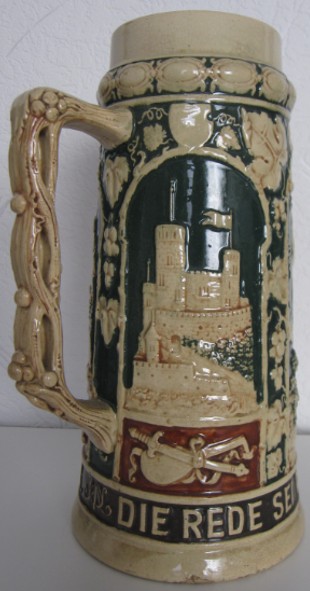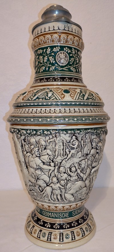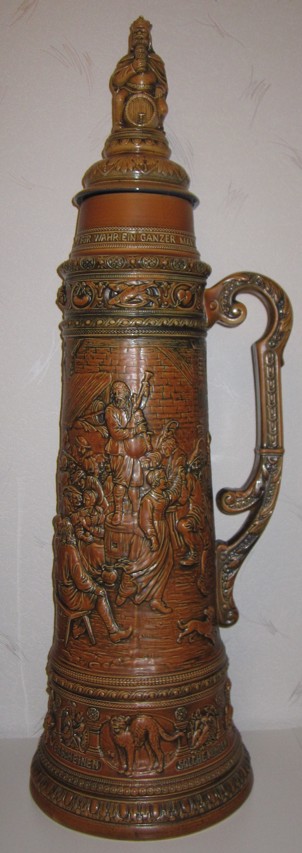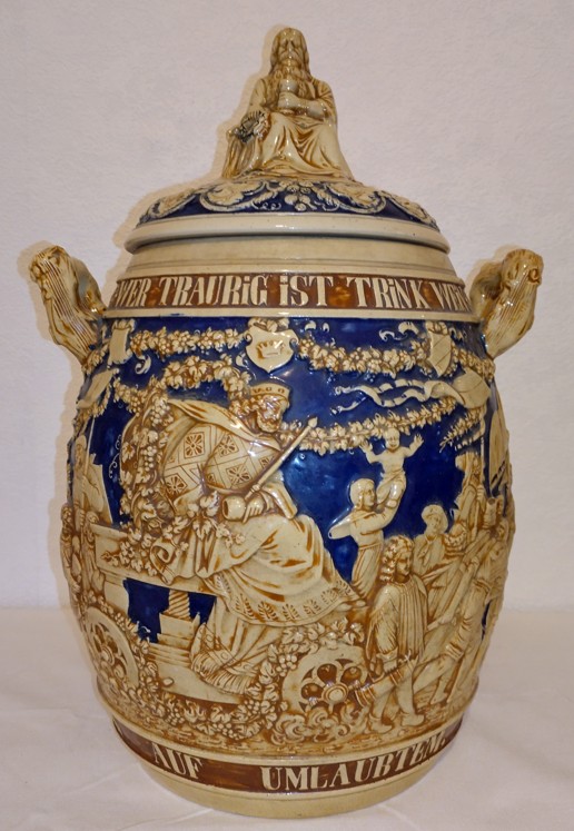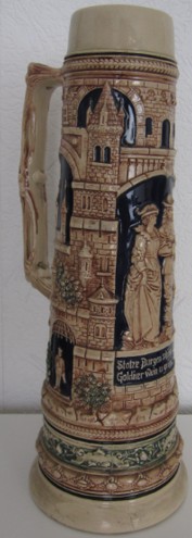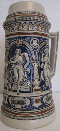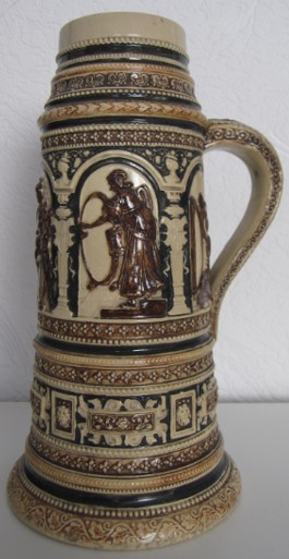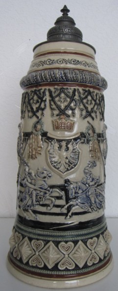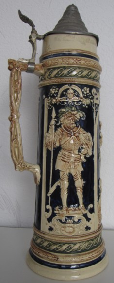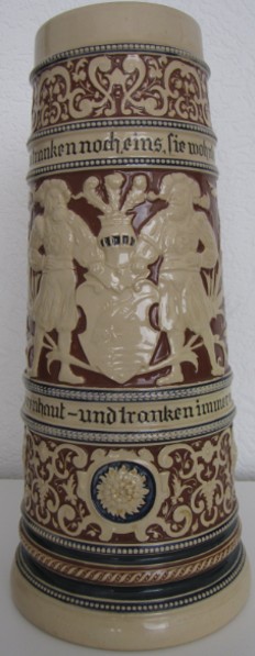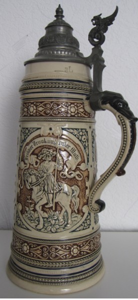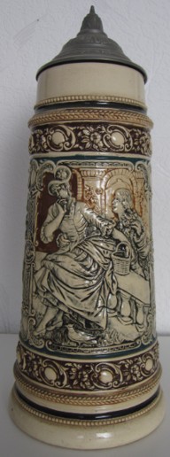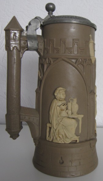 In dieser Epoche blühten auch die zylinderförmigen deutschen Bierkrüge auf, deren Gestaltung deutlich von den architektonischen Formen mittelalterlicher Ritterburgen und Türme inspiriert war. Ihre Reliefs zeigen Szenen aus deutschen Sagen, historische Darstellungen und Einblicke in das damalige Alltagsleben.